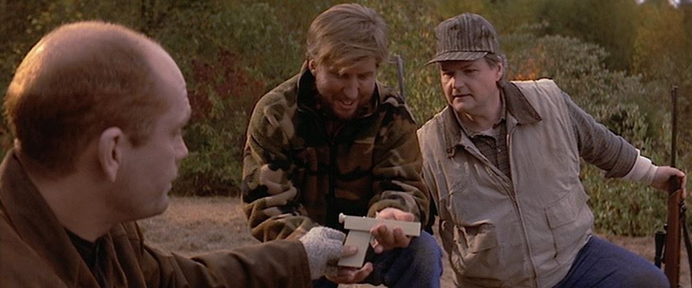 IN THE LINE OF FIRE -- Presidential assassin John Malkovich displays his special weapon to curious fishermen before dispatching them with a practice run of it.