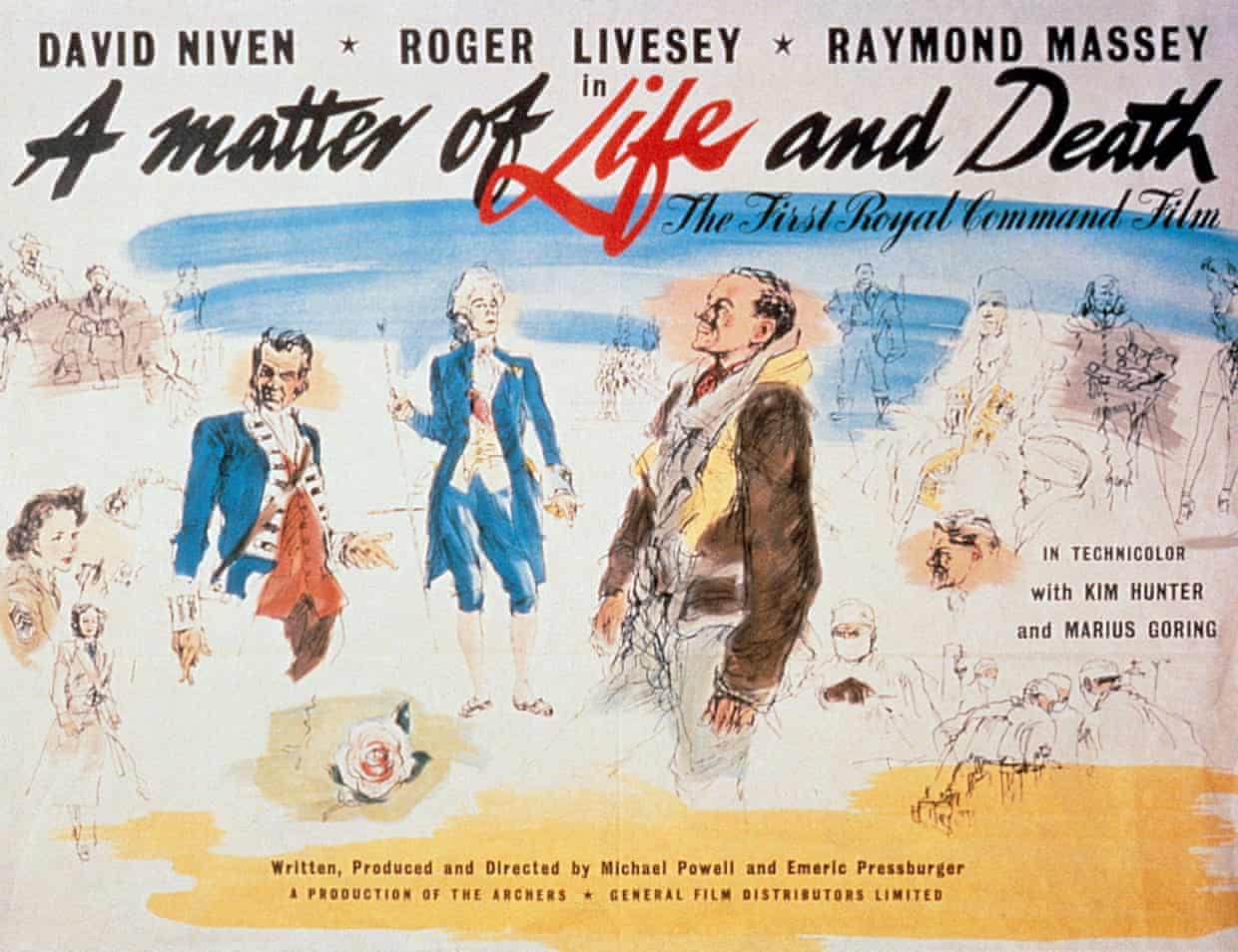 A Matter of Life and Death 1946, the magical world of Powell and Pressburger, were heaven is in black and white, and earth is in imaginative Technicolor. A pilot that should have died survives, causing a stir in heaven, because they miss a dead person up there. Shall they go and get him, or shall love prevail and be put on a heavenly trial.
