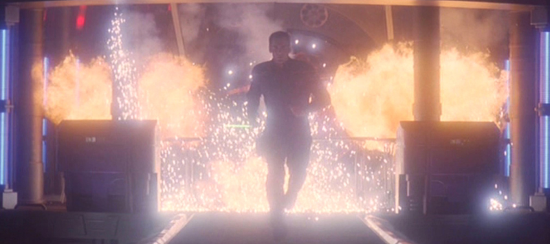 Archer doesn't slow-mo walk away from explosions...he gets the hell out of there (like any sane person would), but everyone thinks he's dead and Porthos is sad (  ), so T'Pol attempts to comfort him in Star Trek: Enterprise - Season 3, Episode 24: 'Zero Hour'.