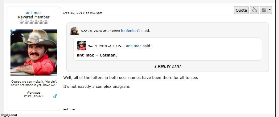 Len, have you been drinking? Not that I disapprove, mind you, but... Seriously? What the wha? The guy posts ant-mac = catman! I thought he was admitting that he was on and the same! So I wrote "I knew it!" to which he responded "the letters in both user names have been there for all to see!" which I took as an affirmation.