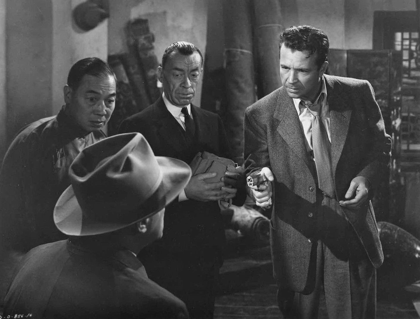 The Man Who Wouldn’t Die / Herbert I. Leeds (1942). Twentieth Century Fox. The fifth of seven films in which Lloyd Nolan played private eye Michael Shayne. At the end of the Fox run, the series moved to the Poverty Row studio PRC where Hugh Beaumont continued the Michael Shayne adventures for another five films, all released in 1946. This one opens with three men carrying a body from a house, placing it in a wood-paneled station wagon (Lordy, remember Woodies?), driving into the woods and hastily burying it. As they are doing this, Kay Wolff (Marjorie Weaver who was cast in two other Shayne films as different characters), prodigal daughter of a rich businessman, returns to the stately manor of her father to tell him that she has got married, causing much consternation. That night, a mysterious figure enters Kay’s bedroom and fires a shot at her. Everyone believes that she what dreaming. What to do but call her friend, the laid-back devil-may-care private investigator Michael Shayne. Nolan is way too antic and tends to get on one’s nerves but as mystery puzzles go, this is one of the better of the Shayne series. Dark Mountain / William Berke (1944). Producer’s Releasing Corp (PRC). Pretty poor crime drama even though it gets off to a fast start with our Forest Ranger hero Don Bradley (Robert Lowery, 1949 cliffhanger serial “Batman and Robin” and “Circus Boy” TV series 1956-7) rushing to fight a forest fire. He disobeys orders by running into the fire to save Susie and Joey who turn out to be horses. But then we settle into a crime story that could not have happened if only one character had a lick common sense. Unfortunately, none do. Bradley goes to town to propose to the Girl He Left Behind only to discover that she is already married. Tough break. However, his ex, Kay (Ellen Drew), learns quickly that her new hubby is a racketeer and murderer. She accidentally gets involved in one of his killings so goes on the run, falling back on Ranger Bradley for a hideout. Elisha Cook, Jr. makes an all too brief appearance. Regis Toomey is the sinister spouse. Affair In Trinidad / Vincent Sherman (1952). The Beckworth Corp / Columbia Pictures. This was the fourth of five pictures in which Glenn Ford and Rita Hayworth co-starred. The first was “Gilda” and “Affair in Trinidad” is very much modeled on that previous film. Hayworth (who was just returning to Hollywood after her marriage to Aly Khan) is even introduced singing in a nightclub dressed in a similar gown to what she wore for the song “Put The Blame On Mama” in “Gilda” and she even does the close-up with the hair flip that was her first appearance in “Gilda.” In the second half, she does a sexy dance to infuriate Ford who slaps her just like in…well, you know by now. As for plot, Hayworth plays Chris Emery whose husband has just been found murdered. Chris is closely questioned by police because her name had been linked with rich guy Max Fabian (Alexander Scourby) who the cops have their eyes on. That’s when the husband’s brother Steve (Ford) shows up unaware that his brother is dead. When he learns the news, he goes on an angry rampage but finds himself drawn to Chris. The story is more than a little by-the-numbers and the ending is pat and abrupt, but with Ford and Hayworth on board the trip to Trinidad is a pleasant one. Also with Juanita Moore and Torin Thatcher.  The Turning Point / William Dieterle (1952). Paramount Pictures. What could have been a routine early 1950s black and white crime picture becomes something special through great direction from veteran Dieterle, set design, and fine performances up and down the cast, especially the three leads. The setting is a midwestern U.S. city riddled with organized crime headed by Neil Eichelberger (Ed Begley). A new commission has been formed to investigate and break Eichelberger’s syndicate. It is to be led by a crusading lawyer named John Conroy (Edmond O’Brien). Amanda Waycross (Alexis Smith), his Girl Friday, is also his fiancé. Among the reporters covering the Conroy Commission is the cynical Jerry McKibbon (William Holden), a boyhood friend of Conroy’s. McKibbon tries to discourage Conroy from his task because he knows a secret: Conroy’s cop father (Tom Tully), who is an investigator for the Commission, is the person who has been leaking Commission plans to Eichelberger. To further complicate matters, Jerry and Amanda find themselves attracted to one another. In two exciting set-pieces, Conroy holds hearings that are broadcast on television as were the real life Kefauver Hearings just a year or so earlier. Carolyn Jones has about a one minute unbilled cameo that is not to be missed. Also with noir stalwart Ted de Corsia and Neville Brand doing his psycho killer thing as only he could do it. Du Rififi Chez Les Hommes (Rififi) / Jules Dassin (1955). France. A seminal and very influential film, one of several from about the same time from around the world that gave us the sub-genre of the “caper” film, viz. a plan for a complicated robbery/burglary/hold-up that requires putting together a team of experts, e.g. a safecracker, a sharpshooter, a driver, etc. It is hard to say which film was the first, probably John Huston’s “The Asphalt Jungle” (1950). The year after “Rififi” came Melville’s “Bob Le Flambeur” and Stanley Kubrick’s “The Killing” and the formula was set – and is still going strong. Witness “Ocean’s 8” and Steve McQueen’s “Widows” – both from 2018. If you want to stretch the definition a little bit, we might also include Kurosawa’s “The Seven Samurai” (1954). Tony le Stéphanois (Jean Servais) is just out of the slammer, broke, and aimless. When a friend offers him a part in a planned smash ‘n grab robbery at a major Paris jewelry store, Tony decides they should go in at night and take away everything. All they have to do is to defeat the most modern security devices that mone