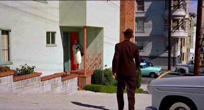 Last decade I attended a professional conference in San Francisco. In between meetings I sought out as many Vertigo sites as I could walk to. To start with is the Brocklebank Apartments from which Scottie followed Madeleine Elster. As Madeleine drives away, the Fairmont Hotel is briefly glimpsed. That is where I was staying, so these two locations were easy. My favorite of my location hunts.  My major find was Scottie's apartment. James Stewart and Kim Novak play a scene on its front porch. When I was there, a line of trees somewhat blocked the view. Today, a wall has been put up around it. The address is 900 Lombard Street. Below, what it looked like in 1958 and then what I saw (but the trees were all filled out).   Another great find was the Empire Hotel (called The York when I visited), where Judy Barton lived. Novak appears at a window while Scottie watches below. It is located at 940 Sutter St. A fan has helpfully provided a pointer to Judy's window.