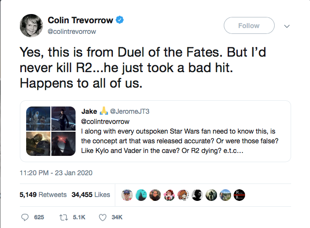 Oh, he did as of 17 hours ago on his Twitter account. I see. Very interesting...I concede on this point.  It isn't so much you're the bearer of bad news, as I am very confused by Mark Hamill's prior comments in regards to Trevorrow's work on the ST.  As am I. But I think I’m starting to put the pieces of the puzzle together. Hamill’s comments may have been based on earlier drafts of Trevorrow’s script. Trevorrow actually began working on episode 9 as early as August 2015. But he wasn’t fired until September 2017. It’s highly unlikely he only had one draft in all of that time. And it’s very likely his script went through considerable changes over the entire course of that time. And at one point there were leak rumors that harmonized with Mark’s comments: www.inverse.com/article/42797-star-wars-episode-ix-rumor-luke-livesBut the final draft of Trevorrow’s script (before he was fired) does indeed have Luke Skywalker as a Force ghost: www.starwarsnewsnet.com/2020/01/full-breakdown-of-colin-trevorrows-star-wars-episode-ix-story.html What exactly were Hamill's comments? From what I'm gathering, he simply liked what Colin did with the character. But even as a force ghost, Luke sounds pretty badass in his version, training Rey from beyond the grave and haunting Kylo and whatnot. So I don't think there's necessarily a contradiction. The biggest confirmed difference between Colin's version and the final episode 9 is that Kylo Ren isn't redeemed, which I can see the producers having a problem with given the psychotic fanbase of future domestic abusers and victims that pity the character and love Reylo. But in any case, I've always figured Colin got fired because of The Book of Henry. The GoT guys being fired after backlash to GoT season 8 is similarly suspect.