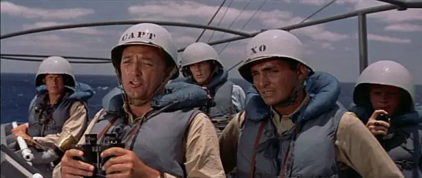 It's been purely happenstance, but I've watched a collection of nautically themed films that have each involved some form of isolation. Pacific Liner (1939)  Chester Morris signs on as ship's doctor just as a cholera outbreak hits the engine room crew overseen by Victor McLaglen, and struggles to keep the disease below decks and away from passengers. Can't get much more topical. The Wreck Of the Mary Deare (1959)  Salvage boat captain Charlton Heston boards a damaged and apparently abandoned freighter and finds only first officer Gary Cooper aboard, acting very suspiciously. Part mystery, part adventure and part courtroom drama, this is the film Alfred Hitchcock agreed to make on a one-picture deal for MGM, but abandoned when he and writer Ernest Lehman couldn't lick the script. They came up with North By Northwest instead. The Enemy Below (1957)   Robert Mitchum and Curd Jürgens, as respective captains of a U.S. destroyer and a U-Boat, engage in a protracted, cat-and-mouse battle of wits and wills in the very best of the submarine films that became so popular in the second half of the '50s. Those have been among my late-night viewing after hubby hits the hay, and the rollicking The Crimson Pirate awaits me on the DVR. Our earlier viewing together has concentrated on great whodunits from English television, some of them revisits like Inspector Morse and Hetty Wainthrop, others new-to-us ones like Grantchester and Vera. Helps for keeping a stiff upper lip. The Enemy Below is one of the first Hollywood films to rehabilitate the American gaze of the German military by showing that “not all of them” were evil Nazis.