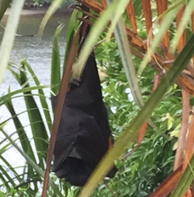 Yup! And ironcially enough, I was arguing with my mother at the time on the phone about China and the dirty markets in Wuhan and attempting to tell her that it was likely caused by bats and then I saw this so snapped it. There was one today, but not as big. They make these high pitch squeals when disturbed. When I moved to the desert near the Salton Sea, every night I saw what I thought was a huge flock of birds circle in the air over a field studded with brilliant lights. Again, this was night mind you, and I was baffled. After about a week I realized this nightly torrent was bats! I have gotten used to them after 30yrs in Oz. Visitors can freak out, because they don't expect to see them and then think vampire bats. They fly around twilight and it is a sight to see. Flying Foxes are very cute, but I'd dare say full of their own disease. Their leathery wing span, beady dark eyes and squeals can be creepy though. Especially when one flies right into you around midnight on a deserted street, like one did to me several years ago.
