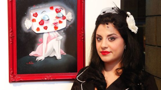 In her paintings there are smiling devils, happy tomatoes, pretty girls eating chocolate shaped like men. Vintage vibe gives her polished paintings a touch of traditional, that again insinuates the need of reevaluation of the family values. Subliminal messages are political and the artist intentionally works on the contrast between joyful and disturbing. Her series called You Look Good Enough To Eat! from 2009 was all made out of oil and acrylic paintings on wood panel. The paintings were friendly, familiar and beautifully stylized, with just a bit of subtle hints on GMO, obesity, and playful jokes on sexual nature of vintage advertisements. Underneath the cuteness lies a hidden reference to vegetarianism, animal treatment and sexuality in sales