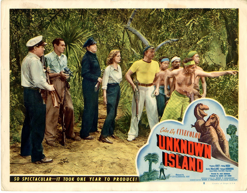 Two sorry examples that were pretty 'bleh'.  Unknown Island (1948) Dir. Jack Bernhard. A similar category... An expedition to an Island somewhere near French Polynesia is seeking the truth behind the rumors of prehistoric beasts still roaming wild. An exciting adventure awaits the expeditioners and romantic rivalry heats up over lone beauty Carole Lane (Virginia Grey). The most exciting beast, an extinct species a Ground Sloth played in suit by Ray Corrigan Skipper , Gilligan ?
