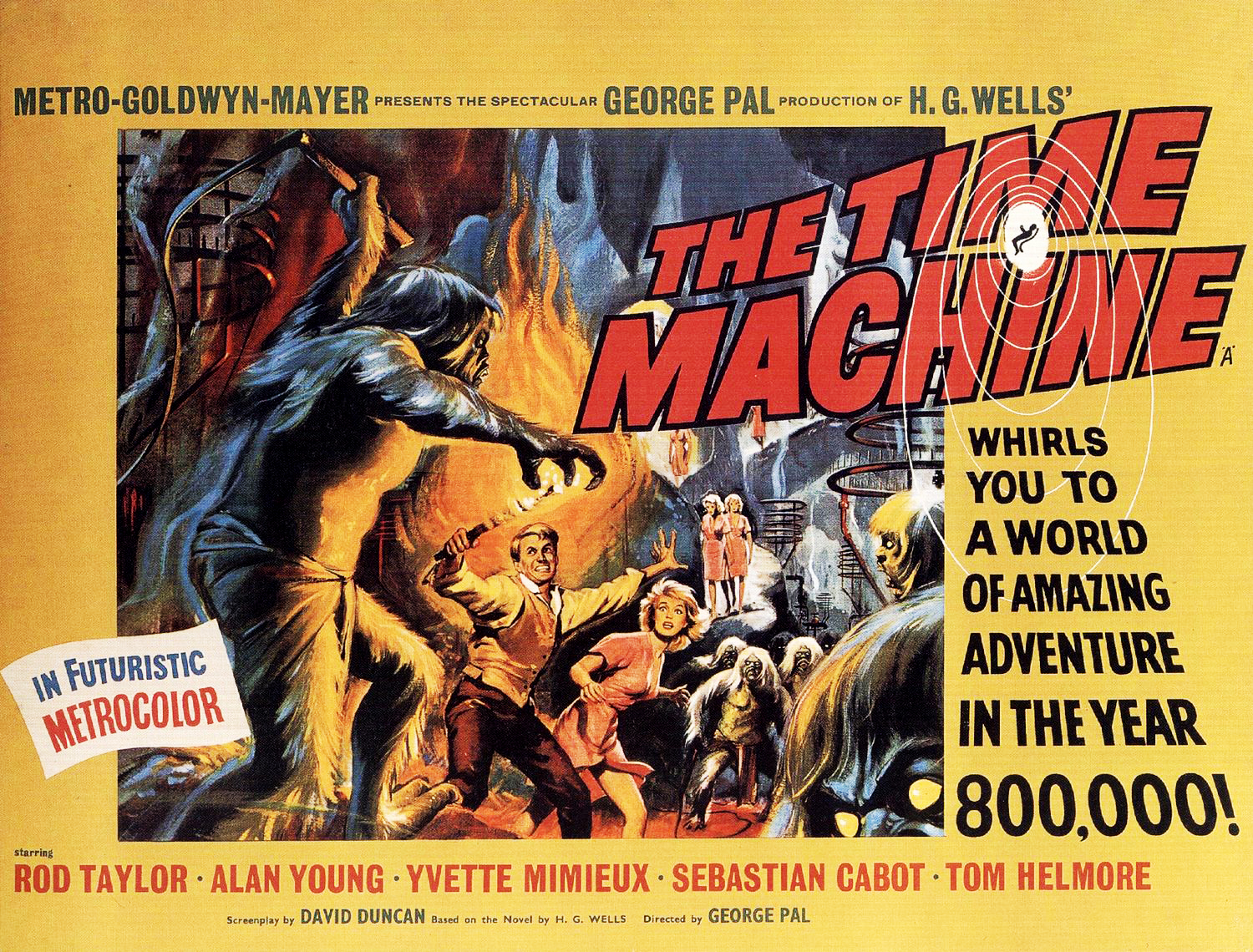 The Time Machine / George Pal. Its U.S. premiere in the U.S. was July 22, 1960 in Chicago. One of my absolute favorite films from my high school years. Another bright and lively George Pal sci-fi adaptation. Full of primary colors; the action and surprises donβt slow down for a second. Often in my life I quote movies in conversation. Most of the time no one gets it but sometimes someone will. On night at work (this was about 10 years ago) after we had closed up and the last customer had finally left, I turned to the gathered staff and said in a monotone voice, βThe all clear has sounded. There is nothing to fear." Three people got the allusion and laughed, one exclaimed, βThatβs my favorite movie!β That is how important this film was to teens from that era. Rod Taylor does very well as H.G. Wellsβ TM inventor. Four delightful character actor faces make up his dinner companions who hear the story of his time adventures. Alan Young, fine Scots actor now famous for acting opposite a talking horse (βMr. Edβ), is the viewer surrogate and has the famous line at the very end. Sebastian Cabot is most well-known for the TV series βCheckmateβ and βFamily Affair.β Tom Helmore, who played Gavin Elster in βVertigo,β plays his character with a slightly sloshed ironic detachment. He comes close to actually believing his friendβs wild tale. Last, two words: Whit Bissell. Has he been in every movie ever made? His biography says that he died in 1996 but sometimes I think I can catch a glimpse of him in new movies. And speaking of falling in love with actresses (were we?), I guess I donβt have to tell you the effect Yvette Mimieux had on adolescent boys. βIβll protect you, Weena.β I canβt get away, though, without talking about the stop-motion special effects. What a kick we got out of the changing fashions of the mannequin in the window. The mountain growing up around and then weathering away from the Time Machine. The changing seasons. The decaying corpse of the Morlock. Spectacular. Wonderful. A beautiful film worthy of love and devotion.