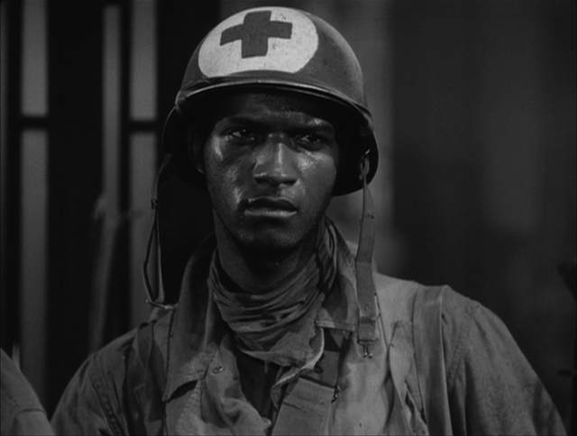 " I'm no straggler..." James Edwards pushes back again, starring as Medic Corporal Thompson in the excellent Korean war drama The Steel Helmet (1951).Produced, Written & Directed by Samuel Fuller Fending off assumptions/accusations of desertion earlier on , Thompson is also targeted by a commie prisoner who attempts to subvert him... The Commie Prisoner:" I just don't understand you. You can't eat with them unless there's a war. Even then, it's difficult. Isn't that so?
