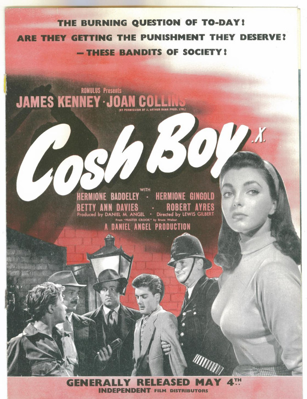 "Gangster" may be overstating the case with my final thought but I think the fact that the character was dating Joan Collins proves conclusively that he's a wrong'un Some great films mentioned, another a fan of Sidney Tafler and Wide Boy the British term used to describe ... a wheeler and dealer a petty criminal who works by guile rather than force. I made mention of this back on the Re-branding the title thread... Cosh Boy (1953) UK Dir. Lewis Gilbert Juvenile delinquent in the backstreets of London Roy (James Kenny) becomes The Slasher in the USA... In the UK Cosh is a kind of truncheon used to hit someone with the sensationalist American poster even has a razor which is not seen in the film !