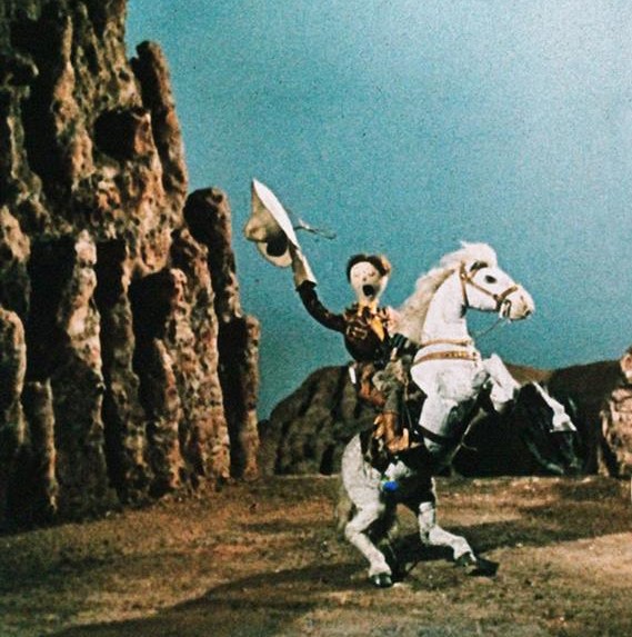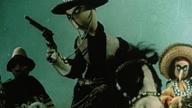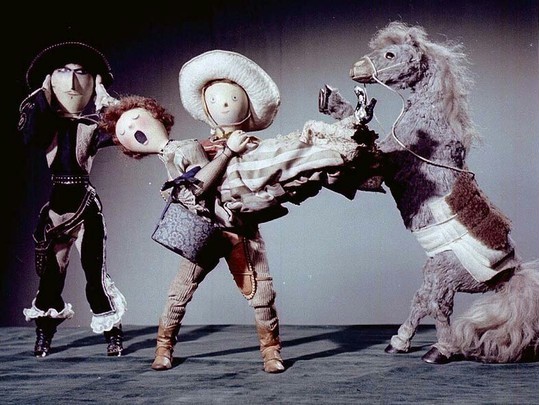 Arie prerie , Song of the Prairie (1949) Czechoslovakia. Directed by Jirí Trnka , Written by Jirí Brdecka, 23 min puppet animation short film. Singing cowboy Lemonade Joe appears on screen for the first time, along with his theme song "Sou Fár Tu Jú Aj Mej". Hero Joe bounds to the rescue of a sweet damsel in distress after she is kidnapped from a stagecoach by a ruthless band of gun toting villains… Jiří Trnka (1912–1969) was a Czech puppet-maker, illustrator, motion-picture animator and film director. Trnka is best known for his work in animation with puppets, which began in 1946. Most of his films were intended for adults and many were adaptations of literary works. At the end of World War II, he founded with Eduard Hofman and Jiří Brdecka the animation studio Bratři v triku. Jiří Brdečka, was a prolific Czech screenwriter and satirist, he was also a fan of the American Western. Brdečka, created the Lemonade Joe character in a 1940 serial, recalling Stagecoach, Wells Fargo (1937), and Frontier Marshal (1939) as the films that inspired his interest in the genre. Using a stop-motion process “Puppet films are truly unlimited in their possibilities…” observed the creative artist. Trnka’s carved puppet characters here are animated within complex sets, emotion and atmosphere are magically brought to life through an expressive use of lighting, sound effect and music. Classic animated entertainment for us big kids, possibly the first Euro “Western” ? Publicity still... The villain, the Damsel, Joe and his horse