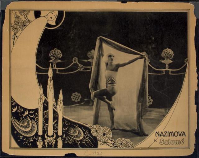 Salome (1923) Dir. Charles Bryant. Regarded as one of the first American "art films" the film is an adaptation of Oscar Wilde's play of the same name written in 1891, and stars Alla Nazimova who also produced this highly stylized version. The play itself is a loose retelling of the biblical story of King Herod and the execution of John the Baptist (in Wilde's play, Jokaanan) at the request of his stepdaughter, Salomé, whom he lusts after. The Dance of the Seven Veils is Salome's seductive dance performed before Herod, The name "Dance of the Seven Veils" originates with the 1893 English translation of Oscar Wilde's play, in which Herod offered his niece a reward of her choice for performing a dance for his guests on his birthday... Wilde was apparently inspired for his own depiction of Salome from a poem written in 1870 by British writer Arthur O'Shaughnessy. She freed and floated on the air her arms Above dim veils that hid her bosom's charms... The veils fell round her like thin coiling mists Shot through by topaz suns and amethysts.