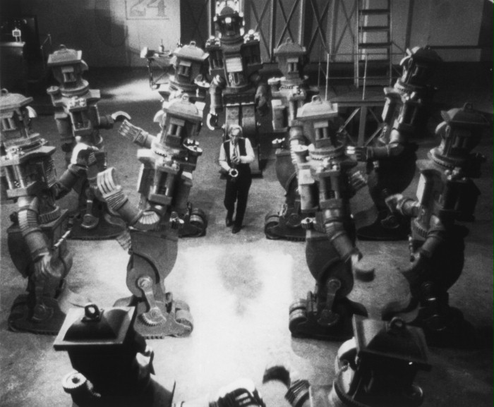 Must be a cinematic first, Dancing Robots. Loss of Sensation (1935) Featured on the Soviet Science Fiction thread. Scientist Jim Ripple creates a robot workforce, he can signal commands to them via musical notes played on his saxophone. One drunken night he abandons himself to a swinging rhythm and his robots start dancing....