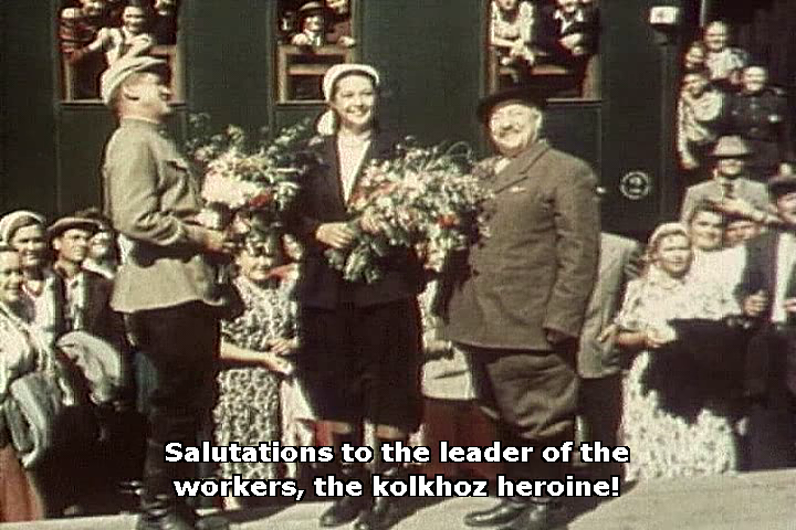 Щедрое лето , Bountiful Summer (1951) Rural villagers arm in arm are making their way to the station where a local work heroine is returning from Moscow. Having received honorary awards, her homecoming is greeted with much excitement and proud celebration. Arriving also is an old friend, assigned as the collective farm's new accountant, his return will inevitably ignite the film's modest romantic intrigue. A bullock cart rolls along, the backdrop is one of vast productive pastures, perched on top of freshly cut straw a young kolkhoz worker sweetly sings of love. Filmed in a pale pastel "Sovcolor" Barnet's romanticized film overflows with an exuberant crazy charm, the films many musical numbers create a stirring somewhat enchanting air of nostalgic naivety, an atmosphere timeless in appeal... On a homely couch two friends reunite, Piotr and Nazar play an accordion and sing a traditional folk tune under a portrait of Stalin, accompanied with the benevolent gaze of Nazar's elderly mother... Under blue skies everyone is busy, beaming with smiles, filling bags of wheat that will be used to feed the country. As productivity records are being broken in the fields the film story concludes. Optimistic characteristics anticipate a bright and happy future in a land of abundance, where the spirit of mutual aid and humility motivate working selflessly for the common good. Propaganda is a fiction like any other. Undeterred in the restrained late Stalin era, Boris Barnet masterly composed another of his impressive works of cinematic art. "We must remember that a socialist state must give a socialist spirit to movie audiences". A triumph of Soviet "socialist realism", exaltation of the peasant and working-class, the glorification of the collective, inspiring heroic destinies. With an idealized coordinated rhythm, workers, trucks, harvesters and tractors all seem to sing in harmonious unison, an anthem of collective progressive prosperity. One of only seven features from Soviet Union cinema in 1951, it was French, film critic, director Jacques Rivette's first film review for Cahiers du Cinéma. Written in Feb. 1953, he praised Barnet and his film... "Truth is often silenced: with the exception of Eisenstein, Boris Barnet must be considered the best Soviet filmmaker... But who is Boris Barnet? No one will know, he murmured himself; surely a man of spirit, taste and heart; Isn't that enough? .."