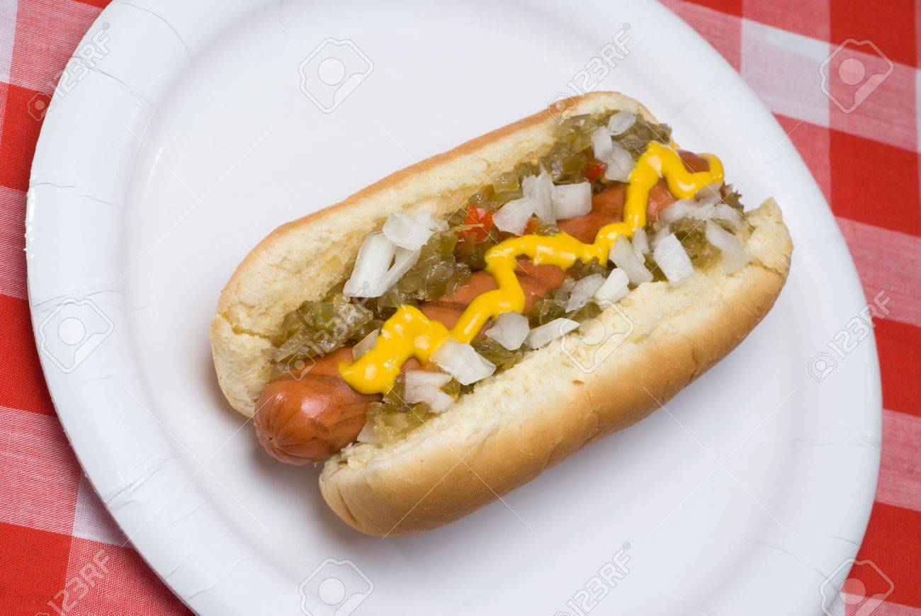 I like mine with yellow mustard, chopped onions & sweet relish. I'll usually toast my buns in the toaster-oven.  This dog is dressed perfectly. Sometimes I'll add jalapeno slices.