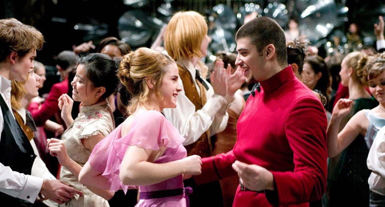 I hope this screenshot of the Yule Ball from Harry Potter and the Goblet of Fire counts/meets your requirements (technically I don't think it was a 'prom' as such - though it kind of seemed like one).    Could someone please find for me a screenshot of a pretty female member of the fae folk?