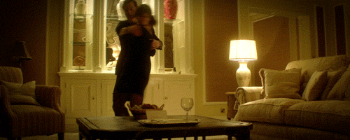 Deadpool (2016).   Please find a 'high angle shot' looking down on someone who is looking up. Here's an example...  Though please try to find one with a female character, rather than two dudes.