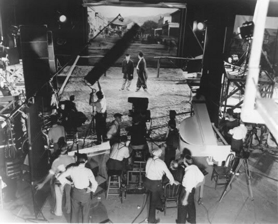 Those "making of images" are terrific ! The Boys are so real that it's odd seeing pictures that show them "just pretending! I've absolutely devoured each of the Fred and Ginger films, particularly the numbers, scrutinizing them countless times over the last 40-odd years - especially so during the few in the late-'70s when I was taking weekly tap classes at the Paul de Rolf or Roland Dupree studios (just for my own exercise and enjoyment) - and know them so well that watching those clips on the ancient laptop with the dead sound card I'm currently using (while my desktop's again on the fritz), I can "hear" the music as I see them only silently. It was around the time of those classes that I again saw Way Out West, that distinctive move caught my attention and I went, "Hmmmm." My dancer squeeze at the time taught me to develop a critical eye, and used to nudge me at revival house screenings, pointing out tiny flubs: "Kelly did a heel drop there that's missing from the sound track." Here's another "making of" image, of Stan and Babe before the rear-projection screen, just for you: