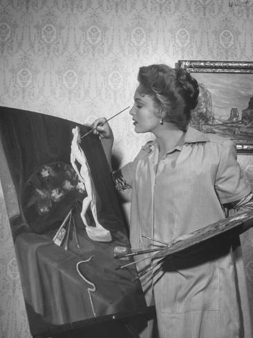 Linda Darnell majored in art she was a talented artist who loved to draw and paint in between filming...  At home in her studio Tetly tea advertisement 1946  Not sure if the man himself is posing in the background ? ...